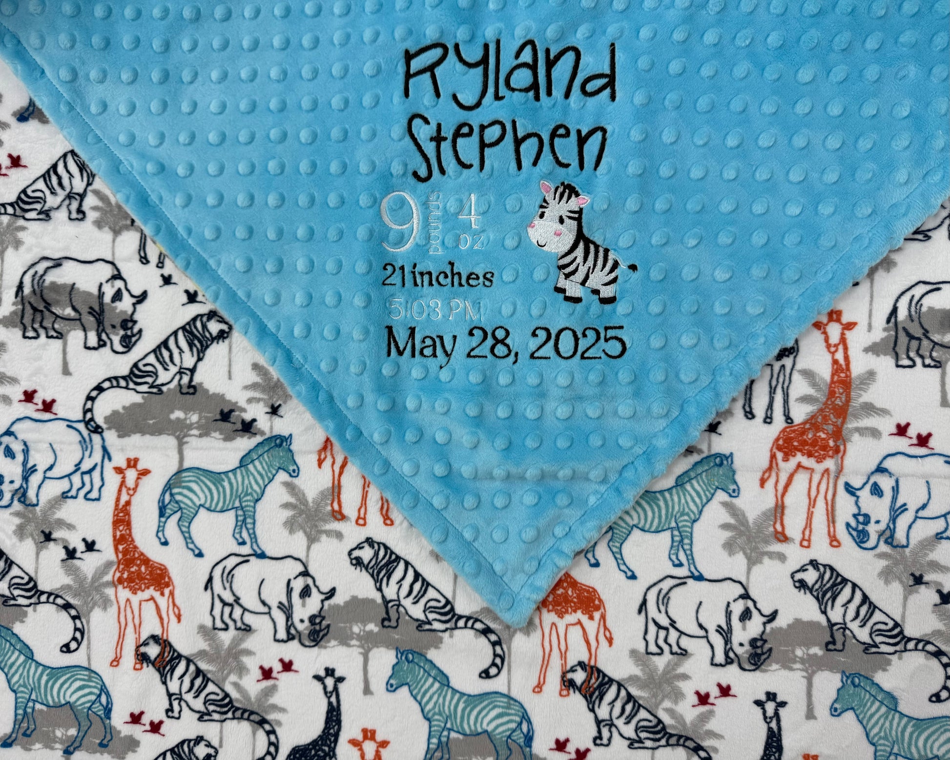 This blanket has smooth minky with jungle animals on one side and turquoise blue dimple dot minky on the other side. The birth stats design pictured is embroidered in black and white with a zebra.