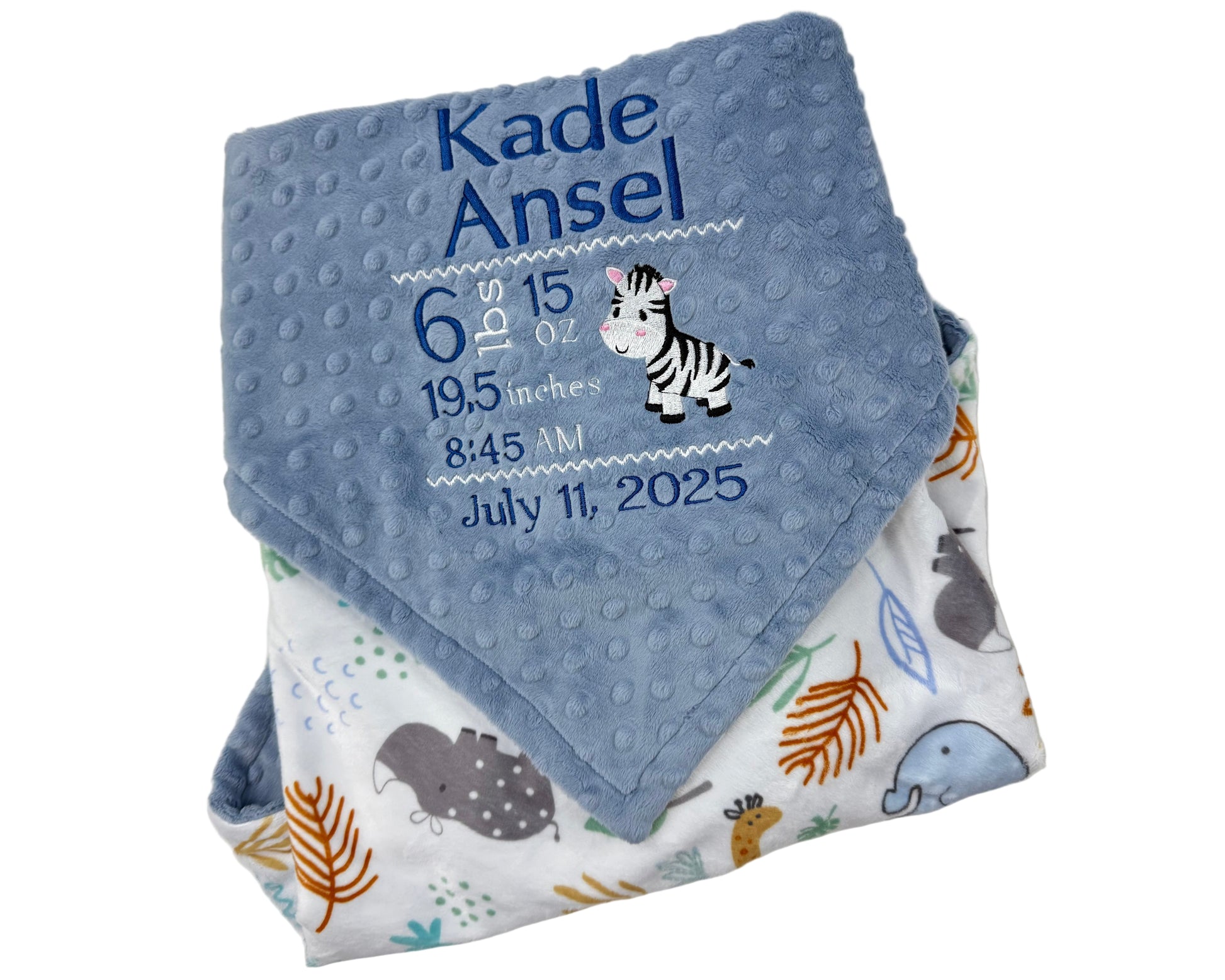 Personalized Baby Blanket in Denim Blue and Jungle Animals Minky, Embroidered Birth Stats with Zebra, Baby Boy Gift