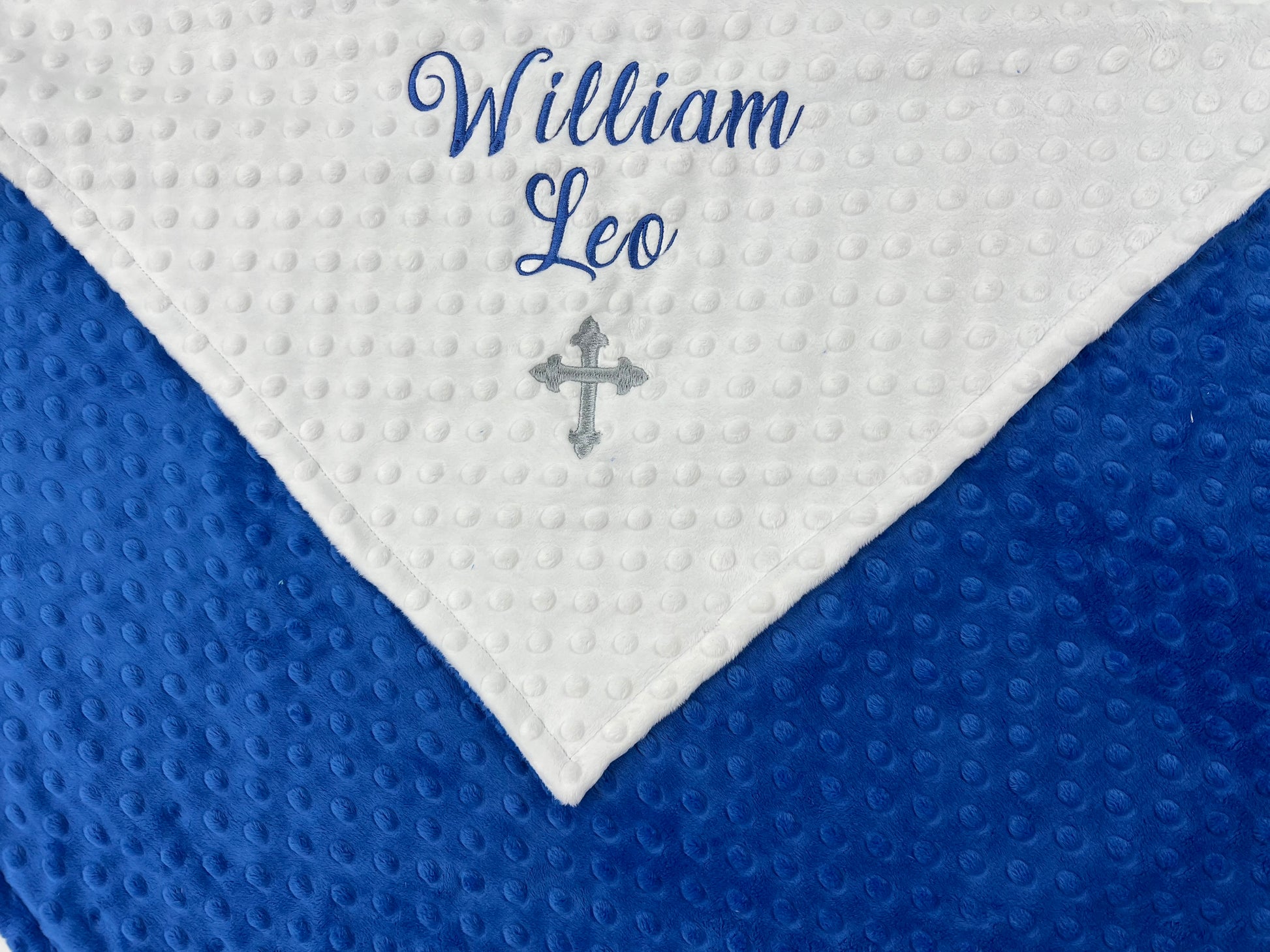 This beautiful baby blanket makes a heartfelt keepsake for a baptism, christening, or baby dedication. The blanket features white dimple minky on one side and midnight blue dimple minky on the other, creating a luxuriously soft and cuddly design that babies love.