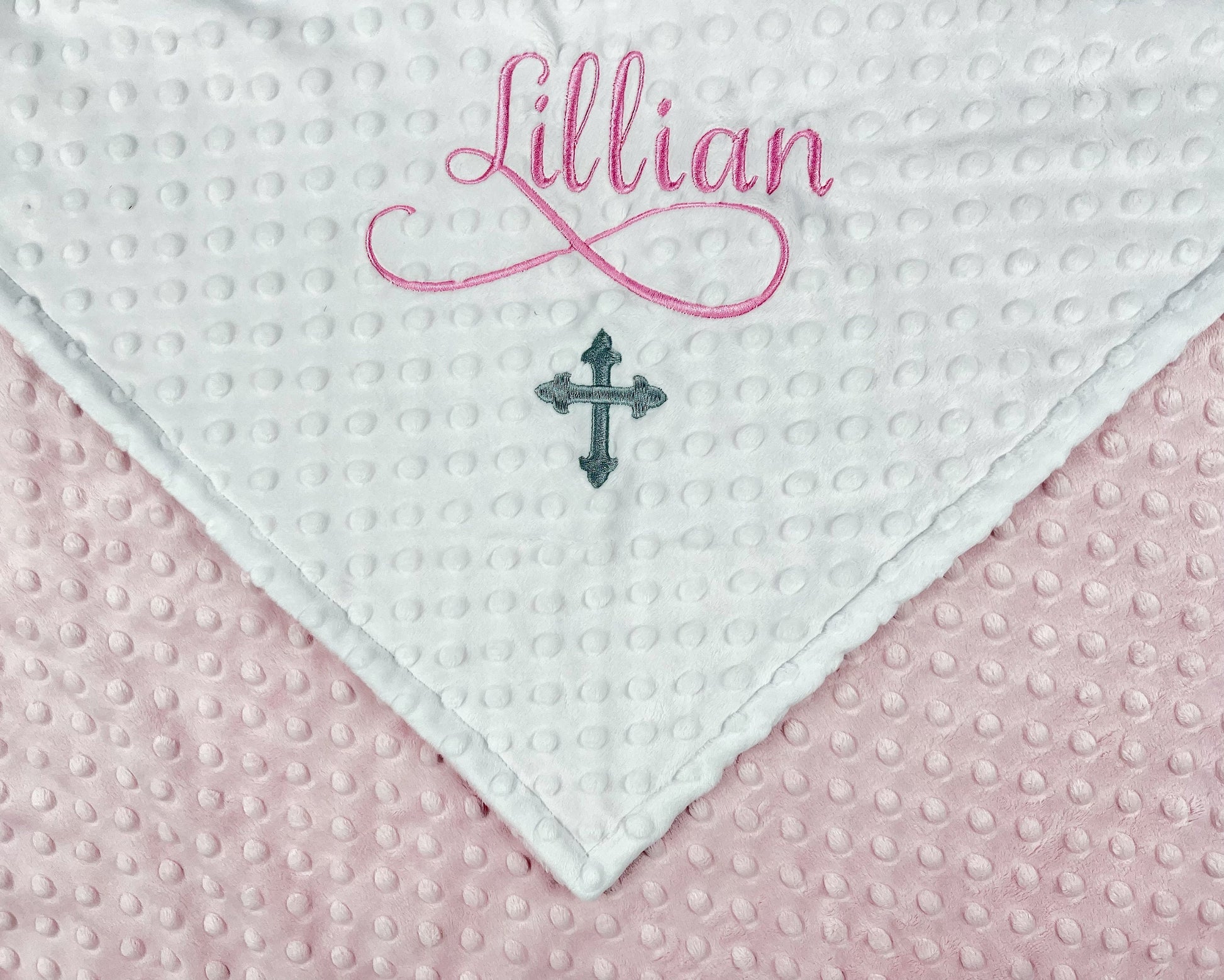 This beautiful baby blanket makes a heartfelt keepsake for a baptism, christening, or baby dedication. The blanket features white dimple minky on one side and baby pink dimple minky on the other, creating a luxuriously soft and cuddly design that babies love.