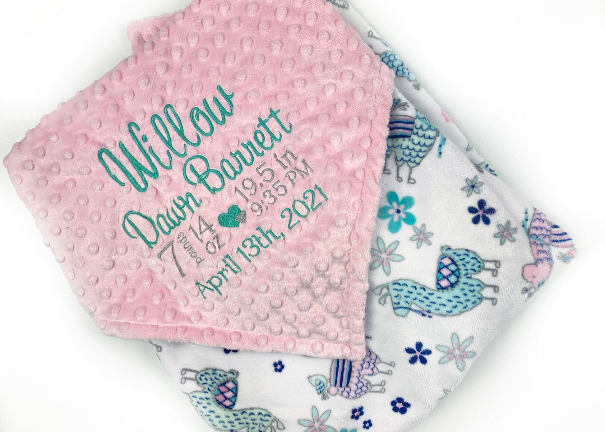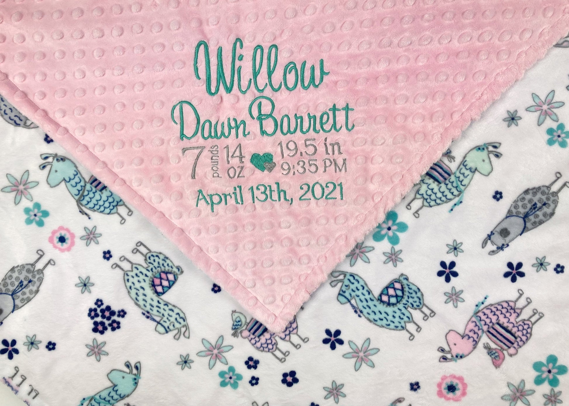 Pink Baby Blanket with Embroidered Birth Stats, Pink and Teal Llama Minky, Keepsake Gift for Baby Girl